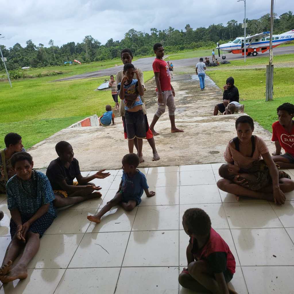Sekitar 60-an warga Kawe dan kampung sekitarnya yang berasal dari Distrik Awinbon, Kabupaten Pegubin menyambut tim Tapem Setda Pegubin di Bandara Danowage, Kabupaten Boven Digoel.